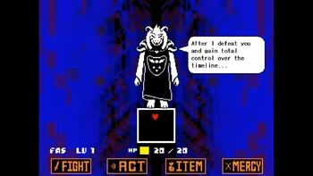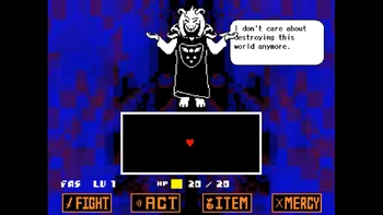 And what does he mean with "world"? Well, the Multiverse, since after that Asriel destroys a timeline on-screen and trasforms in his Final Form, the "world" was ending, meaning that world in context means all the cosmology. And Asriel already implied that he can destroy the Multiverse already in base form. And that's not surprising, since his STATs are infinite, making him on a whole different level from his Photoshop Flowey form.