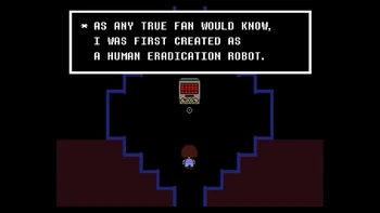 Mettaton, a robot designed to eradicate humans, says that Frisk is a threat to humanity too.